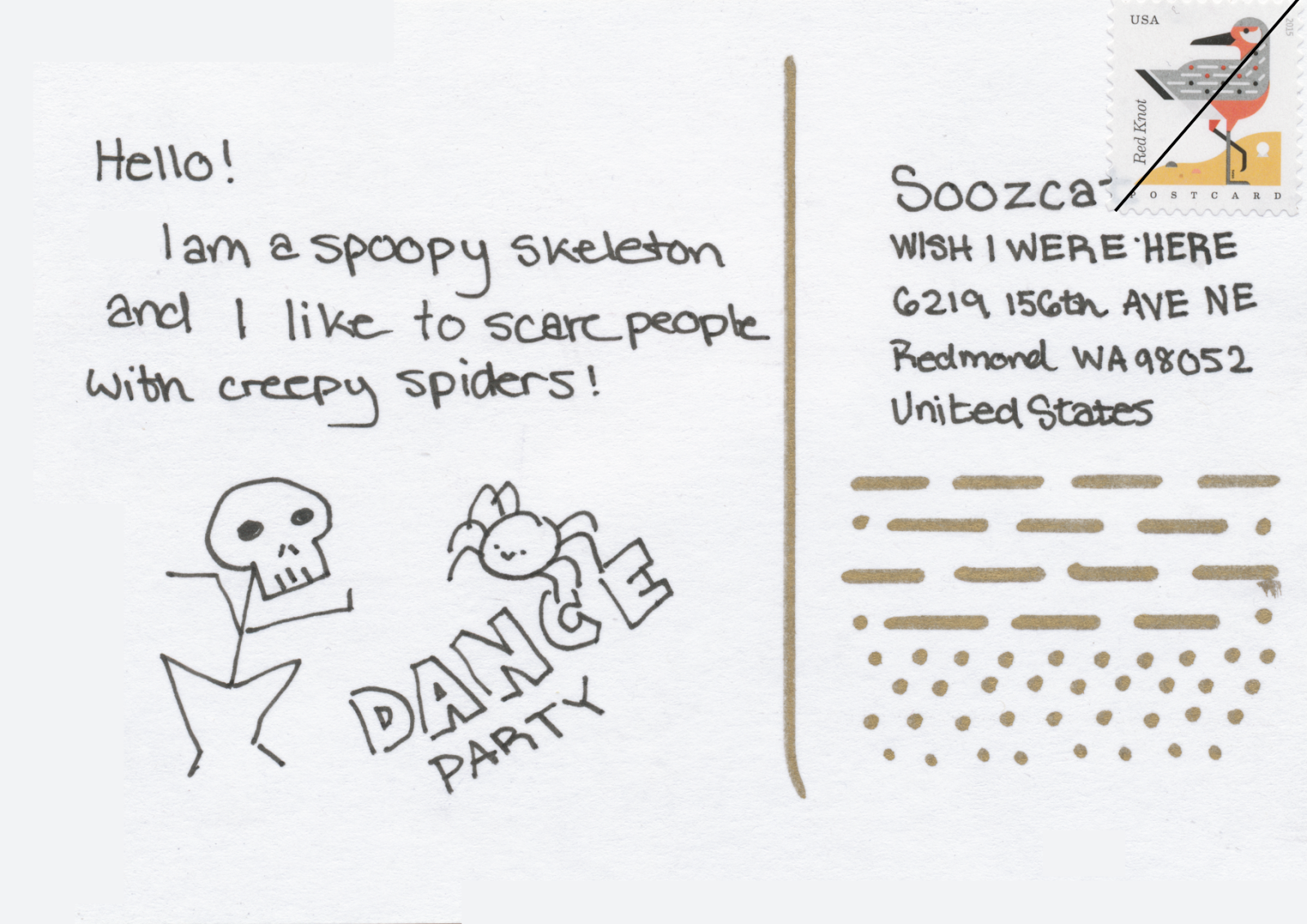 Woo! Get down with your bad self, spoopy friend! (I think you misspelled "creppy," but it's hard to write with bony fingers.) And thank you for the postcard!